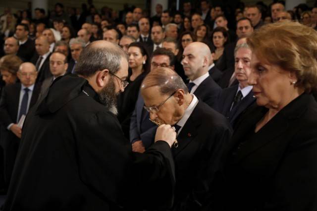 وكان الرئيس عون والسيدة الاولى وصلا الى جامعة روح القدس- الكسليك عند العاشرة والدقيقة الخامسة والعشرين، وكان في استقبالهما عند المدخل، الاباتي الهاشم ورئيس الجامعة الاب البروفسور جورج حبيقة اللذان رافقاهما الى قاعة البابا يوحنا بولس الثاني. وبعدما وضع رئيس الجمهورية وقرينته باقتي زهر امام جثمان المصلوب دخلا الى القاعة وسط تصفيق الحاضرين.