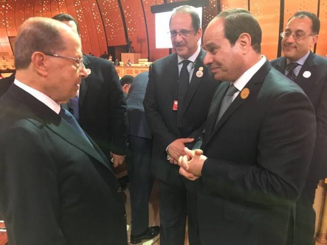كذلك التقى الرئيس عون الرئيس المصري عبد الفتاح السيسي بحضور وزير الخارجية جبران باسيل ووزير الخارجية المصري سامح شكري. وقد هنأ الرئيس عون الرئيس السيسي على إعادة انتخابه لولاية جدية وعرض معه العلاقات الثنائية وسبل تطويرها في المجالات كافة. كما تطرق البحث للأوضاع الإقليمية والتطورات الأخيرة وموقف مصر ولبنان منها. وتم التداول بمتابعة ما كان اتفق عليه الرئيسان خلال القمة التي جمعتهما في القاهرة قبل اشهر.