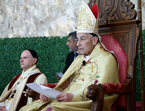 "فخامة رئيس الجمهوريّة العماد جوزاف عون، السيّدة اللبنانيّة الأولى، إخواني السادة المطارنة الأجلّاء، أصحاب المعالي والسعادة، أيّها الإخوة والأخوات الأحبّاء. يسعدنا، فخامة الرئيس، واللبنانية الاولى أن نرحّب بكم على رأس المصلّين، في عيد قيامة الربّ يسوع من بين الأموات، يحوط بكم وزراء ونوّاب ورؤساء مجالس بلديّات ومخاتير وسواهم من العاملين في الحقلين العام والخاصّ، وأن نتقدّم من فخامتكم ومن الحضور الكريم بأخلص التهاني بالعيد، وأطيب التمنيات ليفيض المسيح الربّ عليكم جميعًا نعمه وسلامه، وعلى لبنان الاستقرار والسلام العادل والشامل. ونصلّي معكم، فخامة الرئيس، كي يعضدكم الله وجميع اللبنانيّين في تحقيق أمنياتكم التي أعربتم عنها في كلمتكم بمناسبة مرور خمسين سنة على بداية الحرب اللبنانيّة المشؤومة 1975 وهي: