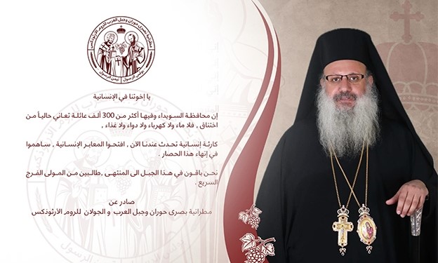 في هذا السياق، جاء بيان المطرانية الأرثوذكسية، الصادر عن المطران أنطونيوس سعد، راعي أبرشية بصرى حوران وجبل العرب والجولان للروم الأرثوذكس، كصرخة مدويّة: “يا إخوتنا في الإنسانية، إن محافظة السويداء، والتي تضم أكثر من 300 ألف عائلة، تعاني حالياً من حالة اختناق حقيقي، فلا ماء، ولا كهرباء، ولا دواء، ولا غذاء…”