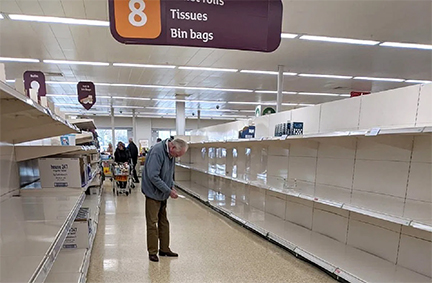 عمَّت وسائطَ التواصل هذا الأُسبوع صورةٌ غصَّت لها القلوبُ والعيونُ حسرةً وبعضَ شفقة، هي صورةُ ذاك العجوز الواقف في أَحد المخازن البريطانية الكبرى، حاملًا لائحةَ حاجاتٍ جاء يشتريها، واقفًا أَمام رفوف طويلةٍ مديدةٍ إِنما فارغة كلِّيًّا من أَيِّ بضاعة.